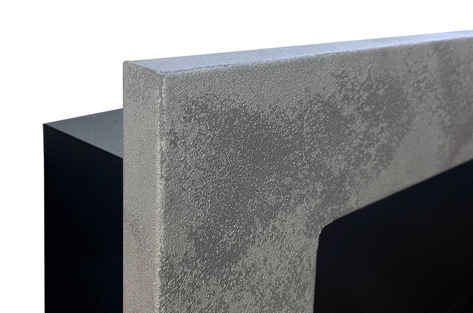Rám biokrbu je ručne natieraný žiaruvzdornou sivou farbou, ktorá sa upravuje šúchaním, čím nadobúda jedinečný charakter v imitácii betónu. Keďže ide o ručnú prácu, každý kus je skutočne jedinečný.