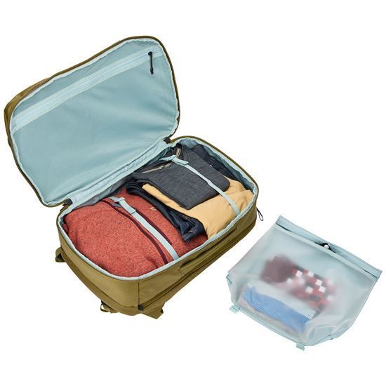 Cestovný batoh Thule Aion o objemu 40 l je vybavený vyberateľným rolovacím vakom a jeho maximálna kapacita je stále klasifikovaná ako príručná batožina, takže je ideálnym batohom pre cestovanie lietadlom. Vyberateľný vak s rolovacou hornou časťou má vložku z TPU, ktorá zaistí, že sa zápach, vlhkosť alebo nečistoty neprenášajú na ďalšie veci v batohu. Navyše sa ľahko čistí, takže je ideálny na uloženie športového vybavenia alebo špinavého oblečenia. Príručný batoh má vyhradené priestory na uložení elektroniky a vrecko na fľašu s vodou. S batohom môžete použiť bedrový pás Thule Aion Sling (predáva sa samostatne), ktorý vám výrazne odľahčí pri chôdzi a okrem toho uľahčí rýchly prístup k najdôležitejším drobnostiam.