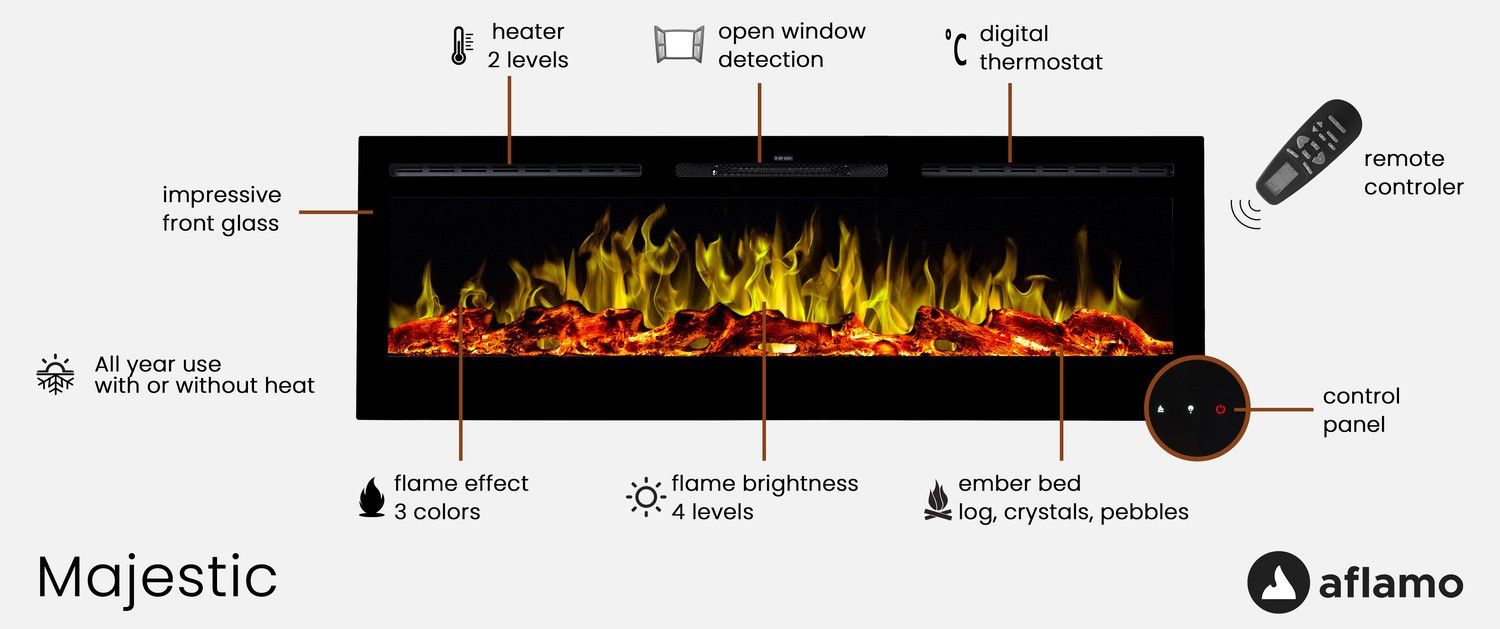 Majestic je zabudovateľný, čiastočne zabudovateľný alebo závesný elektrický krb s čelným presklením a modernou LED technológiou, ktorá znamená nízku spotrebu. Dodáva sa s polienkami, kamienkami aj kryštálmi. Máte k dispozícií všetky tieto možnosti a možete ich striedať.