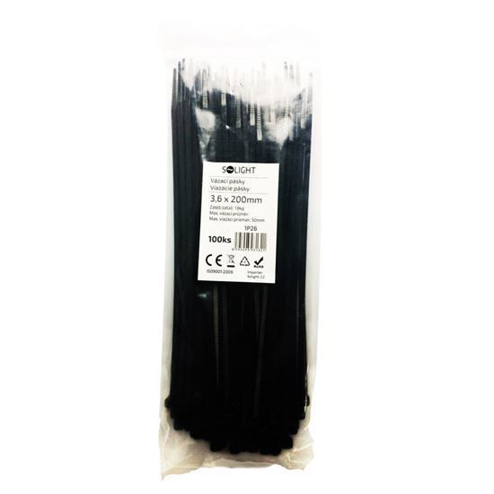 Solight viazacie nylonové pásky, 3,6 x 200mm, čierna, 100ks