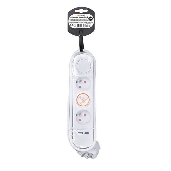 Solight 3z predlžovací prívod s USB A+C nabíjačkou 2,4A, 2m, 3 x 1mm2, biely, vypínač