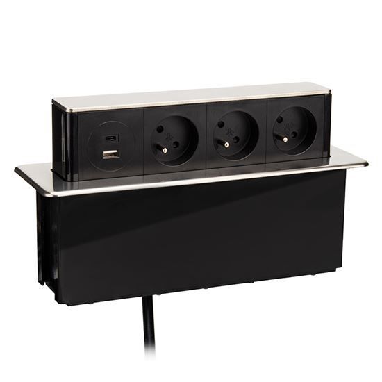 Výsuvný blok so zásuvkami je praktickým doplnkom pre pracovné dosky a stoly, ktorý umožňuje ľahký prístup k elektrickým prípojkám iba vtedy, keď je to potrebné. Tým šetrí miesto a udržuje pracovnú plochu prehľadnú. Vrchný kryt z nerezovej ocele v striebornej farbe dodáva moderný vzhľad a zaisťuje odolnosť voči každodennému používaniu.