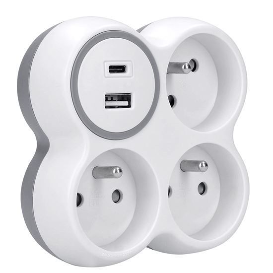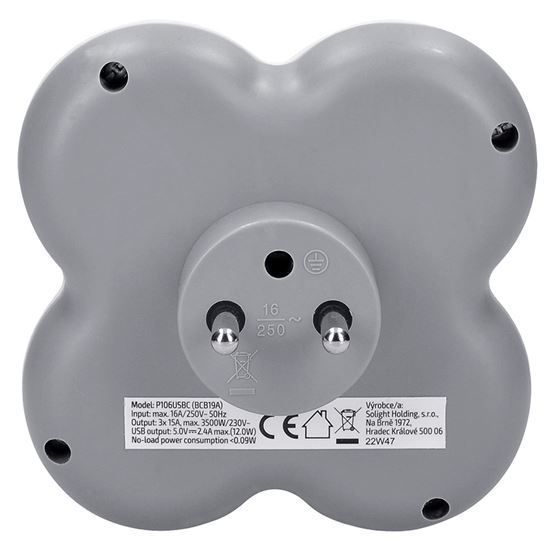 Solight rozbočovač, 3x 15A, USB nabíjačka A+C, biely-sivý