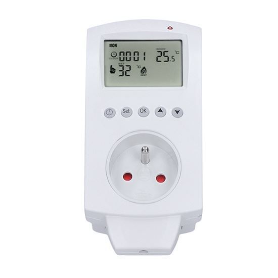 - termostaticky spínaná programovateľná zásuvka pre vnútorné použitie, spína pri dosiahnutí nastavenej teploty