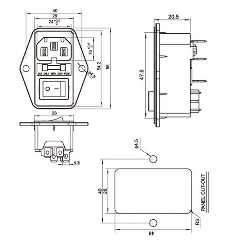 Vstupná napájacia zásuvka s tlačidlom a držiakom na poistku.