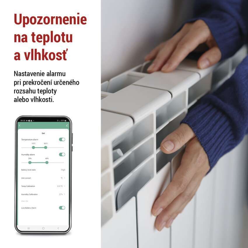 Ak prekročíte nastavený rozsah teploty alebo vlhkosti, dostanete upozornenie na mobilný telefón.
