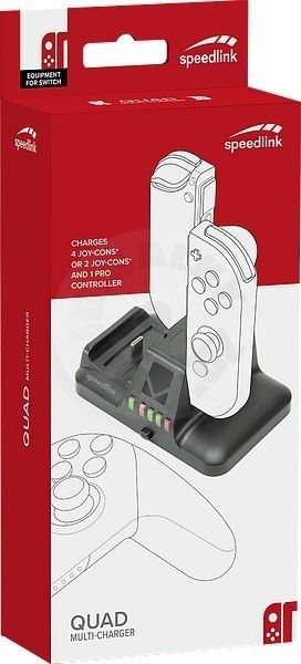 Nabíjačka Speedlink Quad Charger je určená pre ovládače hernej konzoly Nintendo Switch. Umožní nabiť až 4 joy-con ovládače naraz, alebo 2 joy-con ovládače a jeden Pro Controller. Vďaka svojmu designu, nezaberá veľa miesta a jednoducho sa s ňou manipuluje. Stavové LED diódy zobrazujú kedy sú ovládače nabité.