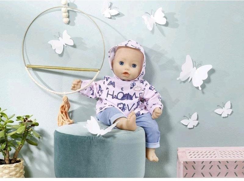 Všade dobre, doma najlepšie! BABY Annabell® a Alexander dnes zostanú doma. Pred terasou totiž stojí strom s ružovými orgovánmi, okolo ktorého sa trepotá veľa motýľov. Takže sa vo svojich súpravách pohodlne usadia pri veľkom okne a pozorujú ich. Na ružovej mikine s kapucňou je vytlačených množstvo motýlikov, rovnako ako na bielych teplákoch. K ružovej mikine sa hodia nohavice v džínsovom vzhľade.