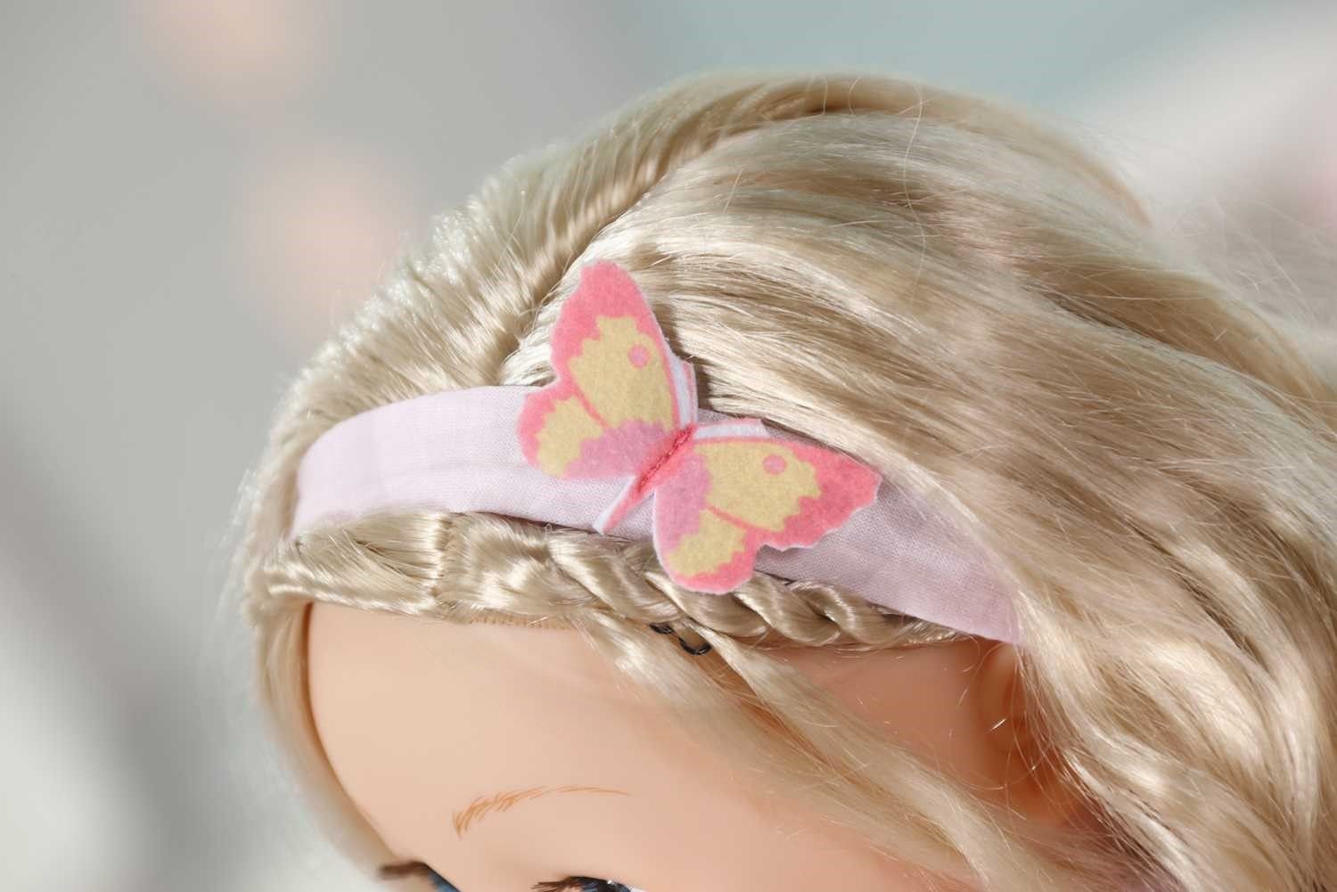 „Sophia, nehýb sa, máš vo vlasoch motýľa!“ Aha, to je len motýľ na čelenke... Sophiine kvalitné blond vlásky možno upravovať do stále nových účesov a rozčesávať ružovou kefou. Malá milovníčka ruží má ale najradšej voľne rozpustené vlasy a ružovú čelenku s motýľou ozdobou. Jej obľúbené kvety má aj na topánočkách a šatách. Horný diel šiat má svetlo ružovú farbu a sukňa je biela. Legíny majú rovnakú farbu ako dlhé rukávy.