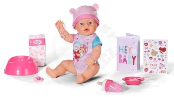 Predstavujeme Emmu! Bábiku Emmu, známu z animovaného seriálu BABY born, na ktorý sa môžete pozrieť na našom kanáli na YouTube, môžete mať teraz aj doma. V novom oblečku as 10 doplnkami. Prináša si so sebou aj kúzelný tanierik: keď do tanierika s bielou doštičkou vo vnútri dáte trochu vody, objaví sa na doštičke lahodné jedlo s roztomilou tvárou, ktoré z kŕmenia bábiky urobí ešte väčšiu zábavu. Keď Emmu po nakŕmení (vodou) alebo po napití vody z fľaštičky posadíte na nočník a stlačíte jej bruško, objaví sa na doštičke v nočníku obrázok cikania a kakania. Keď sa Emma napije vody z fľaštičky, môže roniť slzy a treba ju utíšiť. Pomôcť môže napríklad kúzelný cumlík: keď ho v pusinke otočíte o 180 stupňov, očička sa jej buď otvoria alebo zavrú. Otočte ešte raz a stane sa opak. Emma ale dokáže ešte viac: má pohyblivé kĺby a môžete ju vziať aj do vane. Teraz dokonca uschne rýchlejšie, než kedykoľvek predtým: aby ste bábiku po hraní dobre vyčistili, je k tomu možné odňať jednu nohu a vytvoriť tým väčší otvor na čistenie bábiky. Voda tak z bábiky ľahšie odtečie. Pre ešte zaujímavejšiu hru si Emma do svojho nového domova okrem fľaštičky, cumlíka, tanierika s doštičkou s obrázkom jedla a nočníka s doštičkou s obrázkom cikania a kakania prináša aj plienku, rodný list, hárok samolepiek a dva náramky priateľstva – jeden pre bábiku a jeden pre jej malú maminku a jeden pre jej malú maminku.