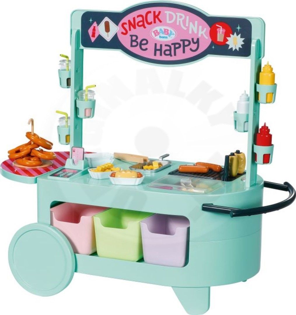 Za zvuku veselej melódie prichádza BABY born v kočíku na pohyblivých kolieskach. V jej batožine: obrovský výber 25 rôznych pochúťok z rýchleho občerstvenia: praclíky, párky, horčica, kečup, hranolky, majonéza, smoothies a dokonca aj zmrzlina. Súčasťou je aj vybavenie na prípravu: grilovacie kliešte, fritovací kôš, úložné boxy, držiaky na fľaše a misky na servírovanie.