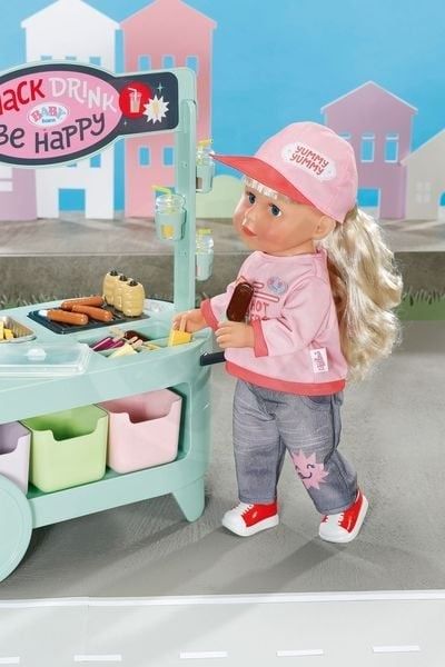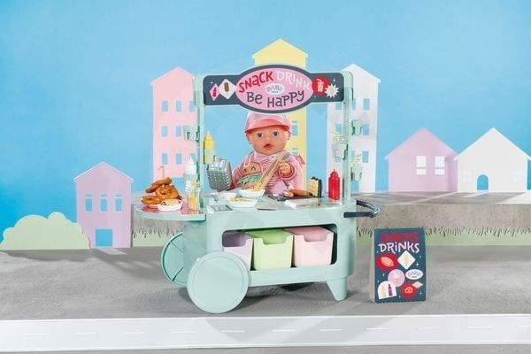 Deti zažívajú rôzne stánky s občerstvením a food trucky na veľtrhu, jarmoku alebo mestskom festivale, a tak sa s obchodíkom s občerstvením obľúbené klasické herné svety prípravy a predaja jedla dostávajú do sveta BABY born – v modernom poňatí.