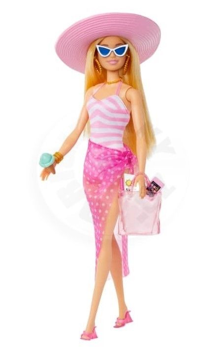 Oddýchni si na pláži s touto bábikou Barbie®! Jej super roztomilý oblečok a tematické doplnky budú deti inšpirovať k vymýšľaniu všetkých možných letných príbehov zaliatych slnkom. Bábika Barbie má na sebe krásne ružovo-biele pruhované plavky. Táto plážová bábika Barbie je okúzľujúcim darčekom pre všetky milovníčky mora a módy Plavky sú doplnené priesvitným bodkovaným sarongom, ktorý má bábika uviazaný v páse Zlaté náušnice a ružové sandálky jej dodávajú na roztomilosti. taška je ideálna pre uloženie opaľovacieho krému, rúžu a smartfónu Kornútok s mätovou zmrzlinou sa pripne bábike k ruke pre realistické pózovanie