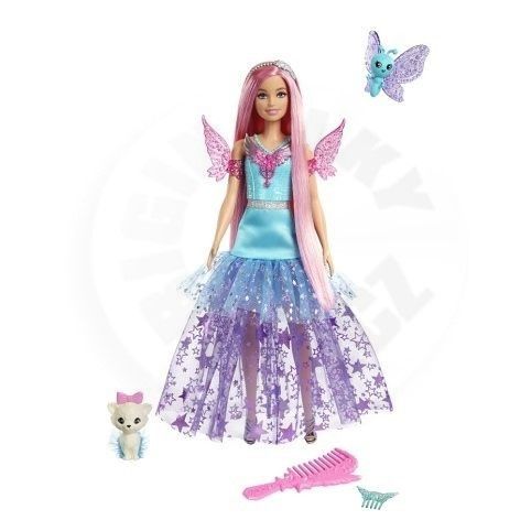 Bábika Barbie® Malibu žiari v šatách inšpirovaných jej kúzelným vzhľadom vo filme Barbie® a dotyk kúzla! Bábika má na sebe rozprávkové šaty s tylovou sukňou ozdobenou hviezdami as detailmi krídiel na živôtiku. Jej miláčikovia sú tiež báječní, prichádza s rozkošným motýlikom a šteniatkom, ktoré nosia roztomilé tutu. Bábika má pastelovo ružové vlasy s dĺžkou 17 cm a doplnky ako hrebeň, trblietavú čelenku a ozdobnú sponku do vlasov. Bábika nevie samostatne štát. Farby a vzhľad výrobku sa môžu líšiť. Parametre: pre holky vek: 3+.