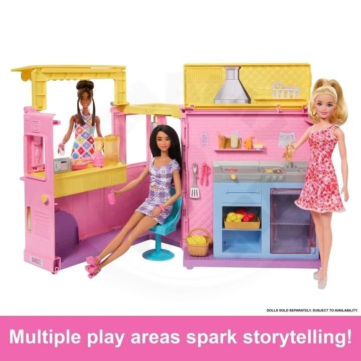Stavte na zábavu 2 v 1: otvorte vozidlo, aby ste využili priestor na prípravu jedla, alebo ho zatvorte a vydajte na cestu. Na boku dodávky a môžete tiež usporiadať miesto na jedenie pod holým nebom s pultom a stoličkou.