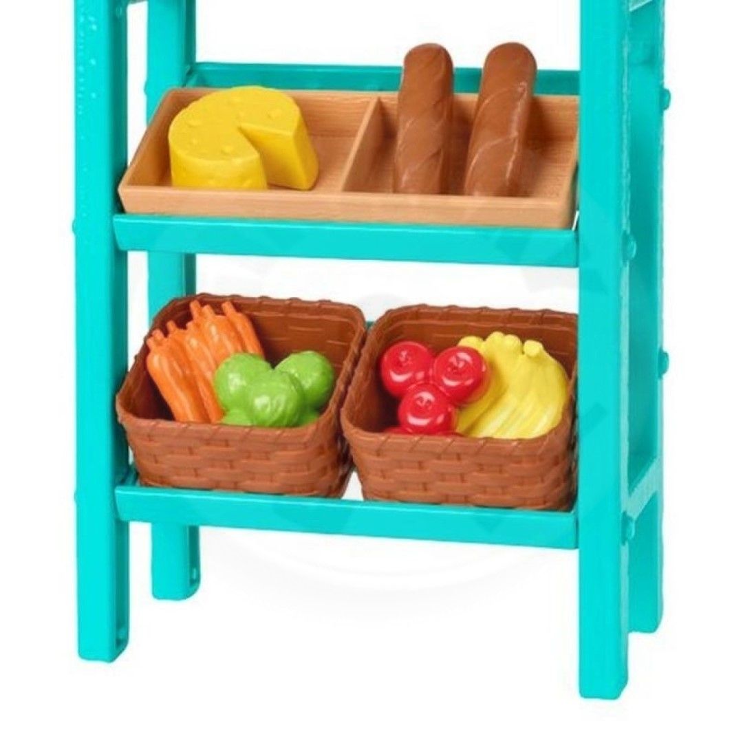 Bábika Barbie® s blonďavými vlasmi má na sebe rozkošné šaty aj topánky a je pripravená pomáhať svojim zákazníkom! Bábika môže vážiť produkty na váhe s pohyblivým ciferníkom a vreckom a predávať tovar zákazníkom pomocou pokladne rovnako ako v skutočnom stánku na farmárskom trhu!