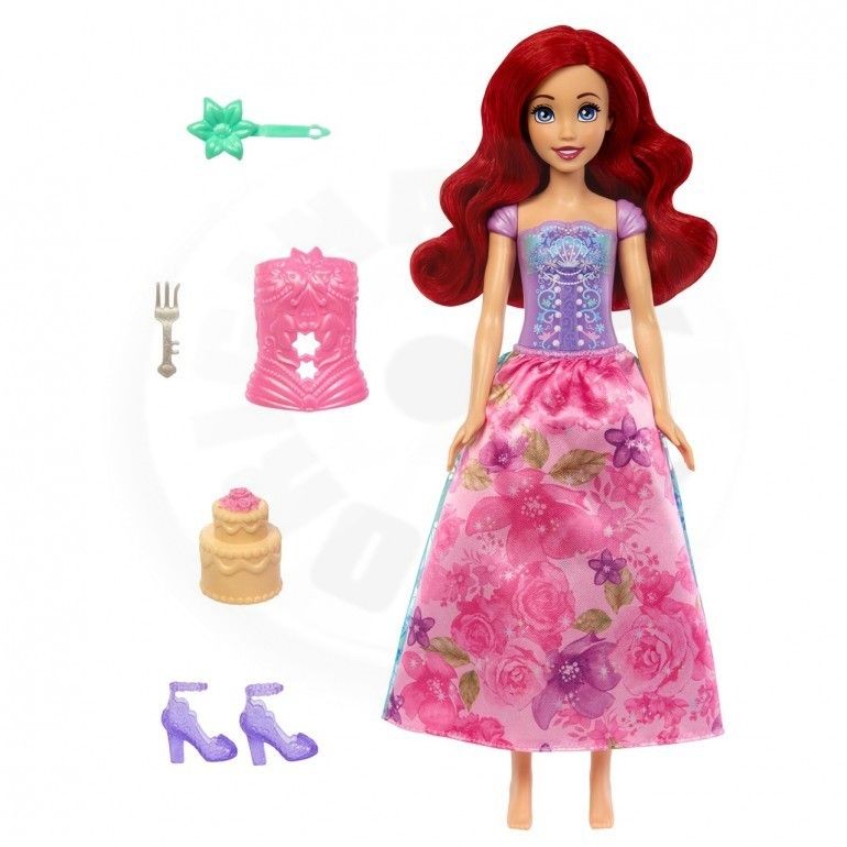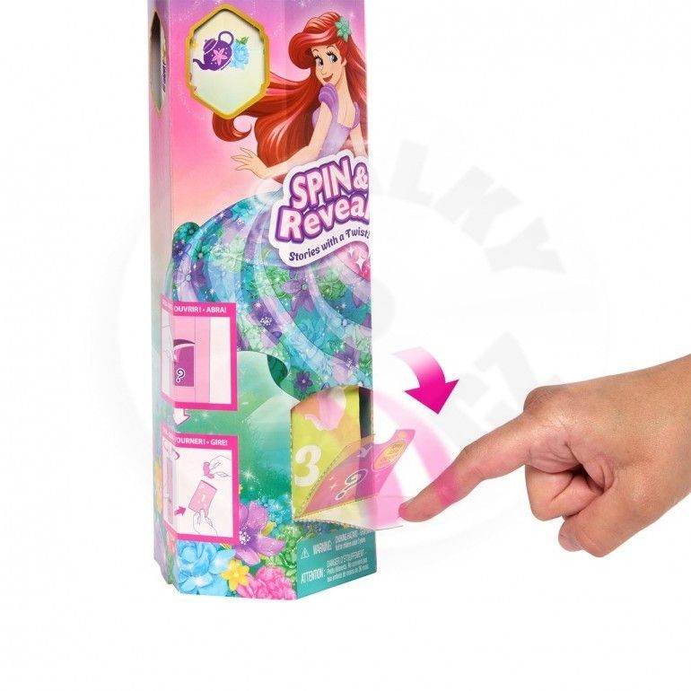 Zážitok z rozbaľovania Disney Princess Ariel Spin & Reveal je čistá mágia. Najprv otvorte kvetinu a odhaľte hernú scénu s tajomnými siluetami. Potom otočte balíček a nájdite 5 záhadných vrecúšok obsahujúcich 5 doplnkov a 5 nálepiek. Posledným prekvapením je módna bábika Ariel s pekným kvetinovým outfitom. Chlapci a dievčatá sa budú baviť obliekaním bábiky do obojstrannej sukne a zacvakávacieho živôtiku a môžu ozdobiť scénu hry a použiť ju ako prostredie na predstavovanie príbehov.