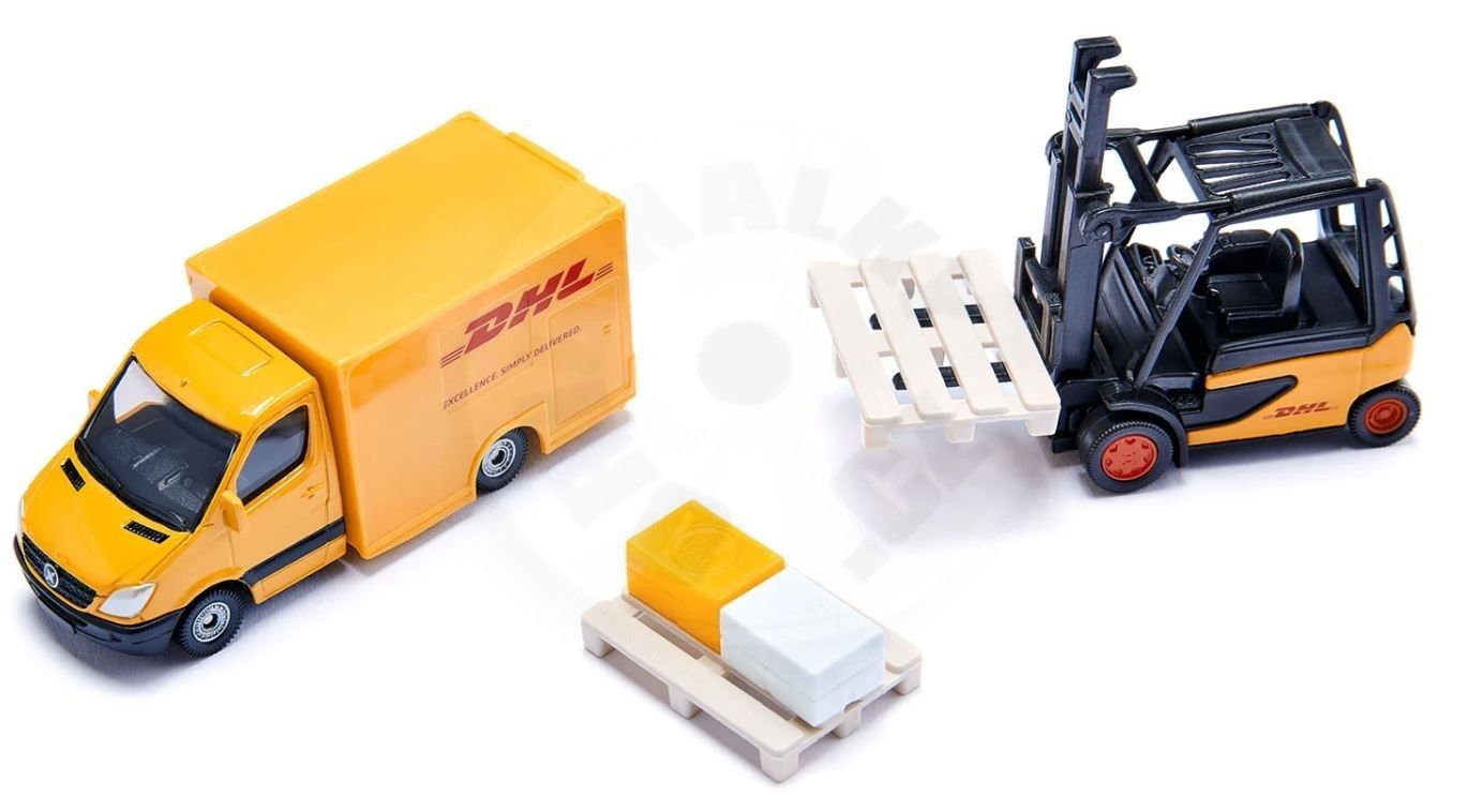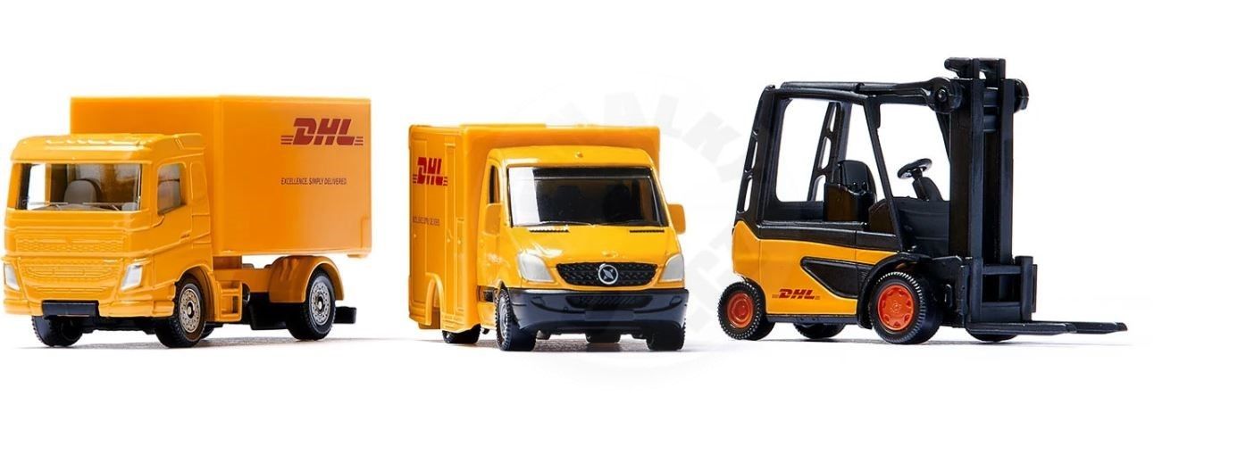 Či už ide o metropolitné mesto alebo ospalú provinčnú dedinu: Žlté doručovacie vozidlá s tromi veľkými červenými písmenami expresného balíka a listové služby DHL sú všadeprítomné. Balíková služba bola založená v San Franciscu v roku 1969 ako spoločnosť na prepravu cenností: Vtedy traja zakladatelia doručovali nákladné dokumenty z lodí a ďalšie dôležité dokumenty lietadlom zo San Francisca do Honolulu. Prvé písmená ich priezviska poskytovali názov spoločnosti: Adrian Dalsey, Larry Hillblom a Robert Lynn. Spoločnosť DHL a jej charakteristické doručovacie vozidlá sú samozrejme nevyhnutné aj v hračkárskych mestách a dedinách každej herne, kde čulo zbierajú a doručujú listy, balíky a balíčky. Logistická sada DHL, skladajúca sa z ťažkého nákladného automobilu, vysokozdvižného vozíka a vozidla na doručovanie balíkov, zaisťuje čo najhladší priebeh služby. Každé z vozidiel je samozrejme okamžite rozpoznateľné vo svojom žltom laku DHL s licencovaným nápisom DHL. Okrem toho je tu celá paleta plná balíkov, ktoré treba doručiť. Dobre, tak ideme... Rozmery: 29,6x4,8x11cm. Vek: 3+