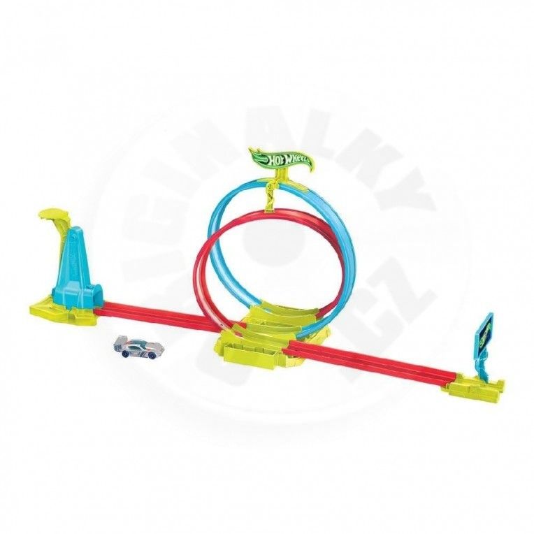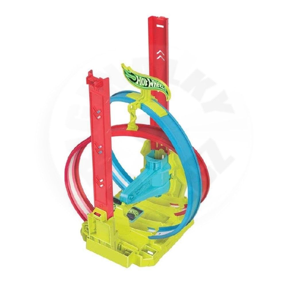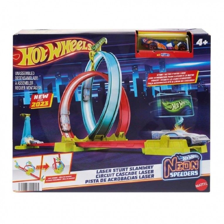 Hot Wheels Neon Speeders Laser Stunt Slamway Trackset (HPC05) Slam štart do dvojitej obrátenej slučky a potom závod cez cieľovú čiaru sady Hot Wheels Neon Speeders Laser Stunt Slamway. Táto sada s neónovou tematikou má billboard, ktorý sa točí, keď autá približujú cieľovú čiaru. Skladovanie je jednoduché a pohodlné: každý komponent je možné ľahko odpojiť a uložiť do určených zásuviek na základni. Je tu dokonca miesto pre priložené autíčko Hot Wheels v mierke 1:64. Farby a dekorácie sa môžu líšiť.