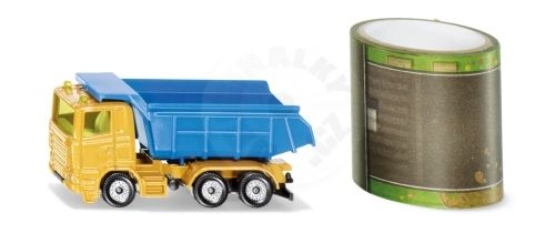 Pozor, práca na ceste! Ťažký nákladný automobil ide hore a naklápa korbu so štrkom. Nákladné auto siku s kovovou kabínou a podvozkom je vhodný na náročné práce na stavenisku. Nákladné auto s pripojeným prívesom, dopravná značka a samolepiaca páska premení detskú izbu na stavenisko. Páska s dĺžkou piatich metrov sa lepí na hladké povrchy a koberce s krátkym vlasom. Rozmer balenia: 19,7 x 7,8 x 5,1 cm. Vek: 3+