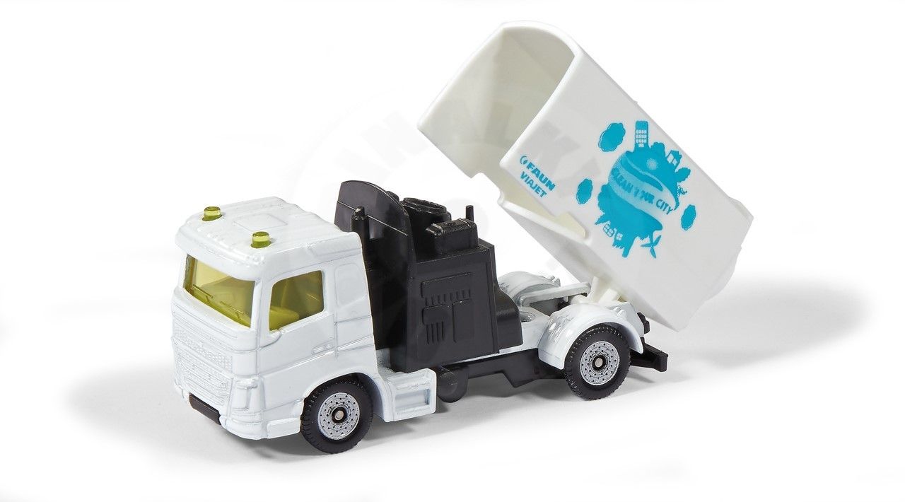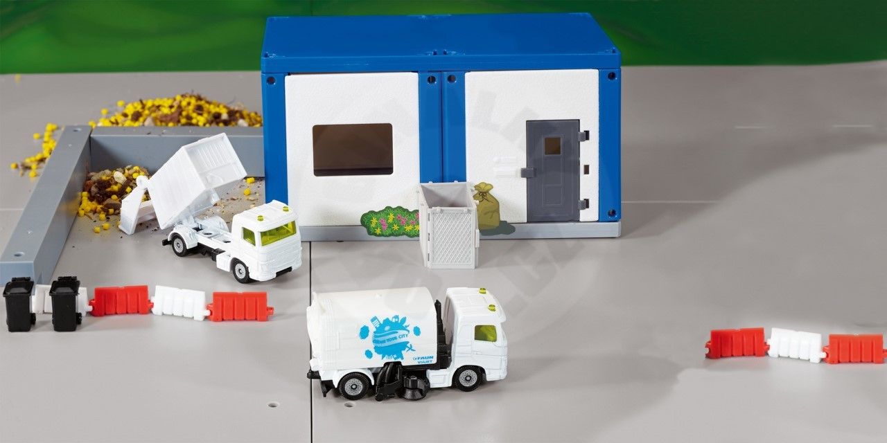 Aby sa ľudia cítili dobre, musí byť mesto čisté a upratané. Presne to poskytuje táto sada od siku, skladajúci sa z zametača ulíc a smetiarskeho vozidla. Neprekonateľné duo upratuje špinu a odpadky z ulíc a námestia a je ideálne vybavené pre všetky úlohy. Obe vozidlá majú dvojnápravový plastový podvozok s voľnobežnými kolesami a kovovou kabínou vodiča. Zametacie vozidlo má nadstavbu a sacie zariadenie z plastu a na smetiarskom vozidle možno plastovú nadstavbu sklopiť a otvoriť zadnú klapku. Obe vozidlá sú bielej farby a sú vyrobené firmou Faun Umwelttechnik. Na zvozovom vozidle je vytlačené „Clean your City“ – vhodné logo pre zábavu v herni, ktoré sa s touto sadou komunálnych vozidiel medze nekladú! Rozmery balenia: 19,7 x 7,8 x 3,2 cm. Vek: 3+