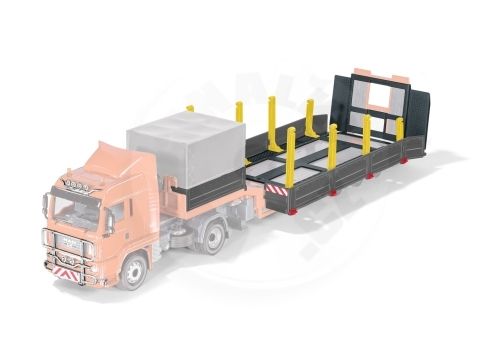 SIKU CONTROL – platforma pre SIKU CONTROL pre dlhý náklad. So svojou novou plošinovou nadstavbou je populárny ťahač SIKUCONTROL MAN s nízkozdvižným vozíkom dokonale vybavený na bezpečnú prepravu húsenicového bagru SIKUCONTROL Liebherr R980 SME na stavenisko. Nadstavba sa jednoducho položí na nízkozdvižný vozík. To rozširuje plošinu a tiež sklopnú rampu pripravenú na jazdu. U dlhých materiálov, ako je drevo, rúrky alebo tyče môžu byť vložené stĺpiky. Sada obsahuje tri dĺžky stĺpcov v sadách po ôsmich. Nadstavba plošiny je doplnená plošinou s plachtou na mieste nad spojkou. To je miesto, kde môžu byť bezpečne uložené popruhy, trámy a kužele. Mierka: 1:32. Rozmer: 308 x 158 x 68 mm. Vek: 3+