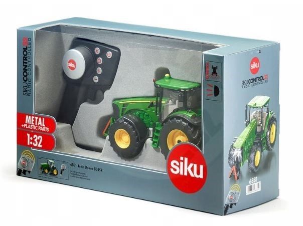 Kvalitný kovový traktor John Deere 8345R s diaľkovým ovládačom. Nové a vylepšené ovládanie uľahčuje presné riadenie a manévrovanie. S týmto modelom je možné použiť množstvo doplnkov s radu SIKU Farmer 1:32. Traktor má 2 motory. Existujúce rádiové komponenty využívajúce vlnovú dĺžku 2,4 GHz. Stabilné a vysoko kvalitné traktory vyrobené z tlakovo liateho kovu a plastu sú ľahko ovládateľné s novo vyvinutým modulom rádiového ovládania. Svetlo vpredu a vzadu je počas prevádzky trvalo zapnuté. V pohotovostnom režime, tj. Po zapnutí modelu a pred pripojením k rádiovému riadiacemu modulu blikajúca kontrolka signalizuje, že model je pripravený na spustenie. Model je napájaný tromi štandardnými batériami „AAA“. Je možné tiež použiť dobíjacie batérie rovnakého typu. Ak batérie počas prevádzky klesnú pod určitú úroveň, kontrolka rýchlo bliká, čo značí, že batérie budú čoskoro vybité. Rádiová riadiaca jednotka napája aj dve rovnaké batérie. U týchto modelov je možné použiť všetky prívesy a spojovacie zariadenia SIKU Farmer32 pre prednú a zadnú spojku. Dátová zásuvka integrovaná v zadnej časti traktorov uľahčuje použitie modelov príslušenstva Control, ako sú prívesy, vírivé hrable a pluhy. Mierka: 1:32. Rozmer: 197 x 91 x 111 mm. Vek: 3+