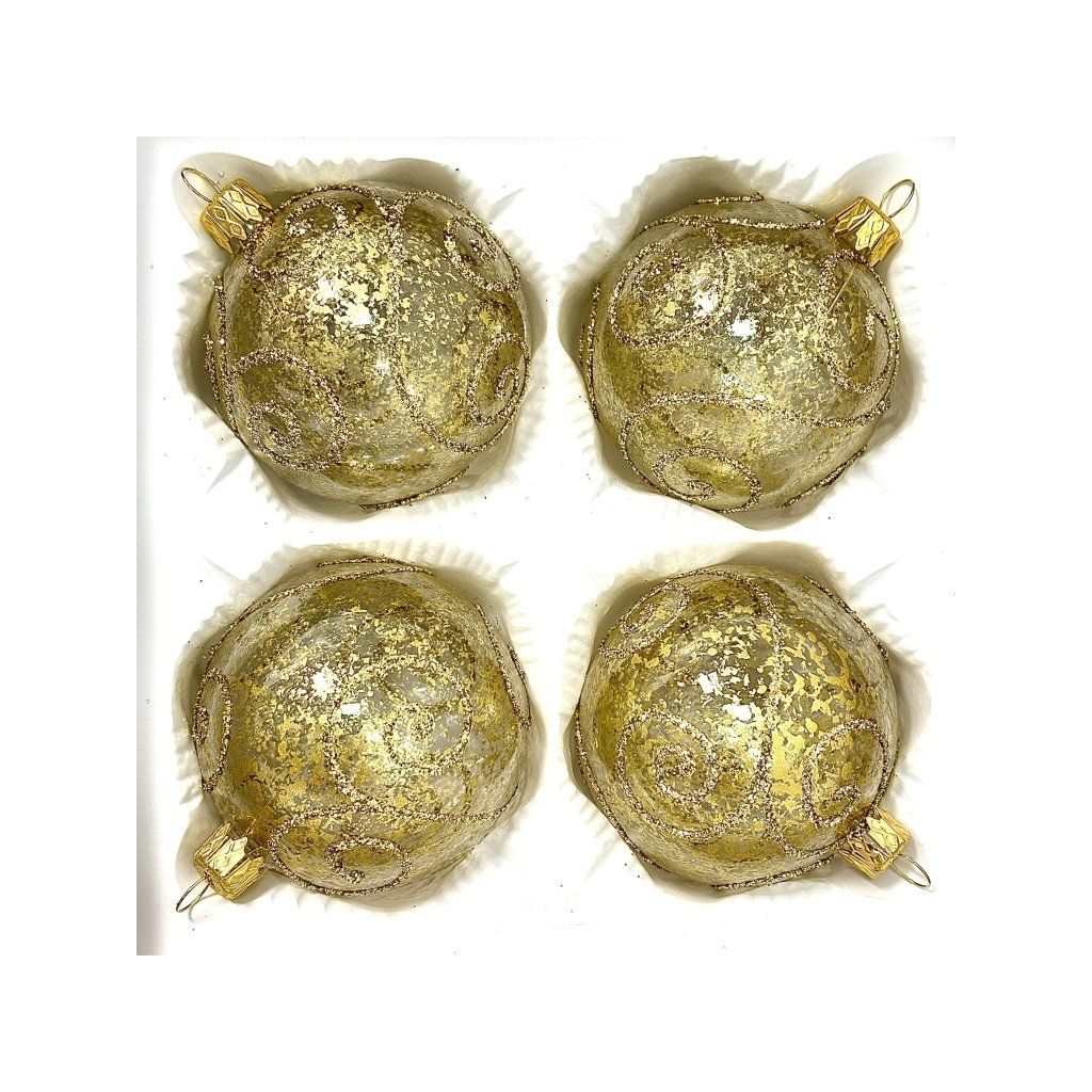 Elegantná sada štyroch čírych sklenených gulí s priemerom 7 cm je zdobená zlatou metalickou patinou s jemnými špirálami z trblietavého glitra. Ozdoby evokujú noblesu aj nostalgiu a krásne vyniknú ako na zelenom stromčeku, tak vo vianočnom aranžmáne. Každý kus je ručne fúkaný a dekorovaný v tradičnom štýle v dielni IRISA Vsetín.