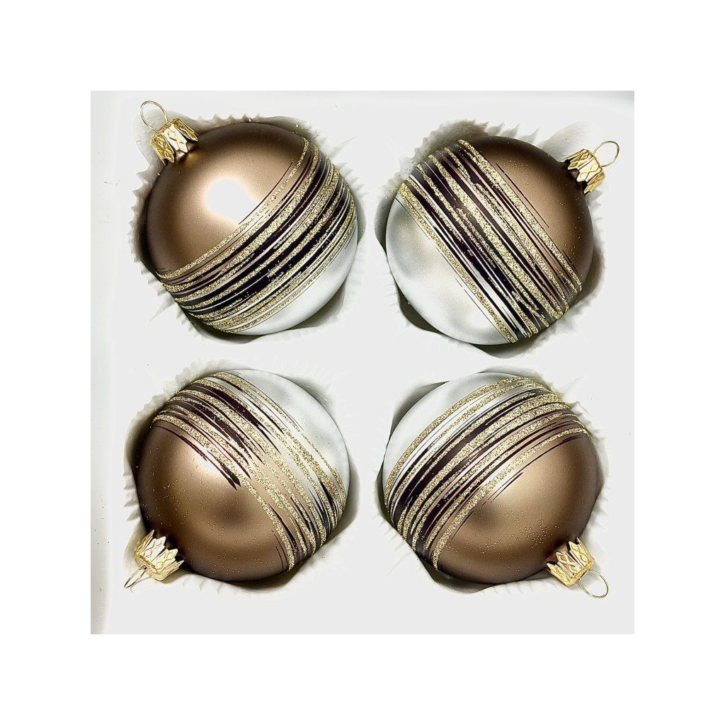 Sada štyroch českých ručne fúkaných gulí Ø 7 cm v trendy kombinácii matnej cappuccino hnedej a saténovo striebornej. Dekor zvýrazňujú jemné, ručne ťahané prúžky platinového glitra.