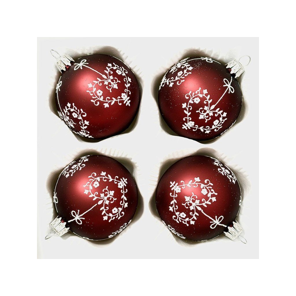 Vneste na stromček hrejivú romantiku adventných večerov. Sada štyroch sklenených gulí s priemerom 7 cm zaujme bohatým matne rubínovým podkladom, na ktorom ručná maľba vytvára jemné biele srdce poskladané z drobných lístkov a kvetov, zaviazané nežnou mašľou. Kombinácia matu a trblietavých detailov dodáva ozdobám hĺbku a krásne odráža svetlá sviečok aj reťazí. Každý kus vzniká tradičnou technikou ručného fúkania a maľby v spoločnosti Irisa Vsetín – popredným českým výrobcom vianočných ozdôb od roku 1954. Dodávané v pevnej kartónovej krabičke z recyklovaného papiera; bezpečné na uskladnenie aj vhodné ako darčekové balenie.