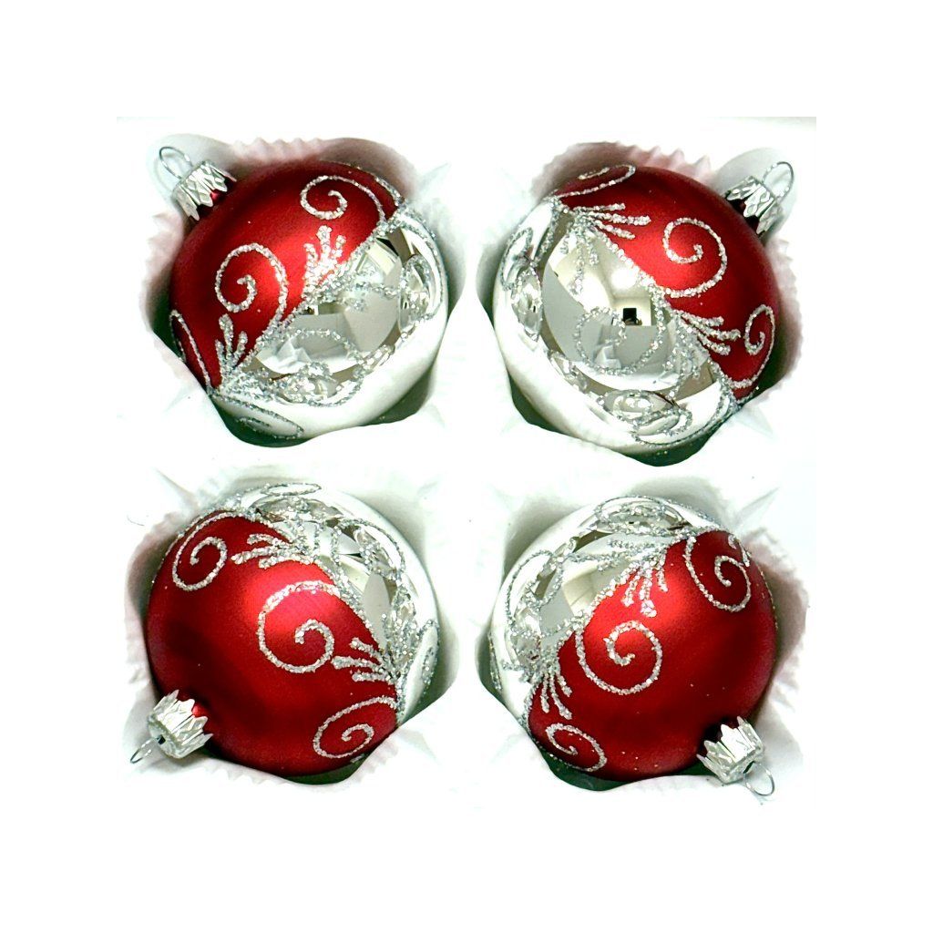 Ručne fúkané gule z českého skla s priemerom 7 cm. Zamatovo červený povrch prechádza do zrkadlovo striebornej polovice; obe časti spája špirálový ornament zo strieborného glitra. Súprava 4 ks v ochrannej papierovej krabičke.