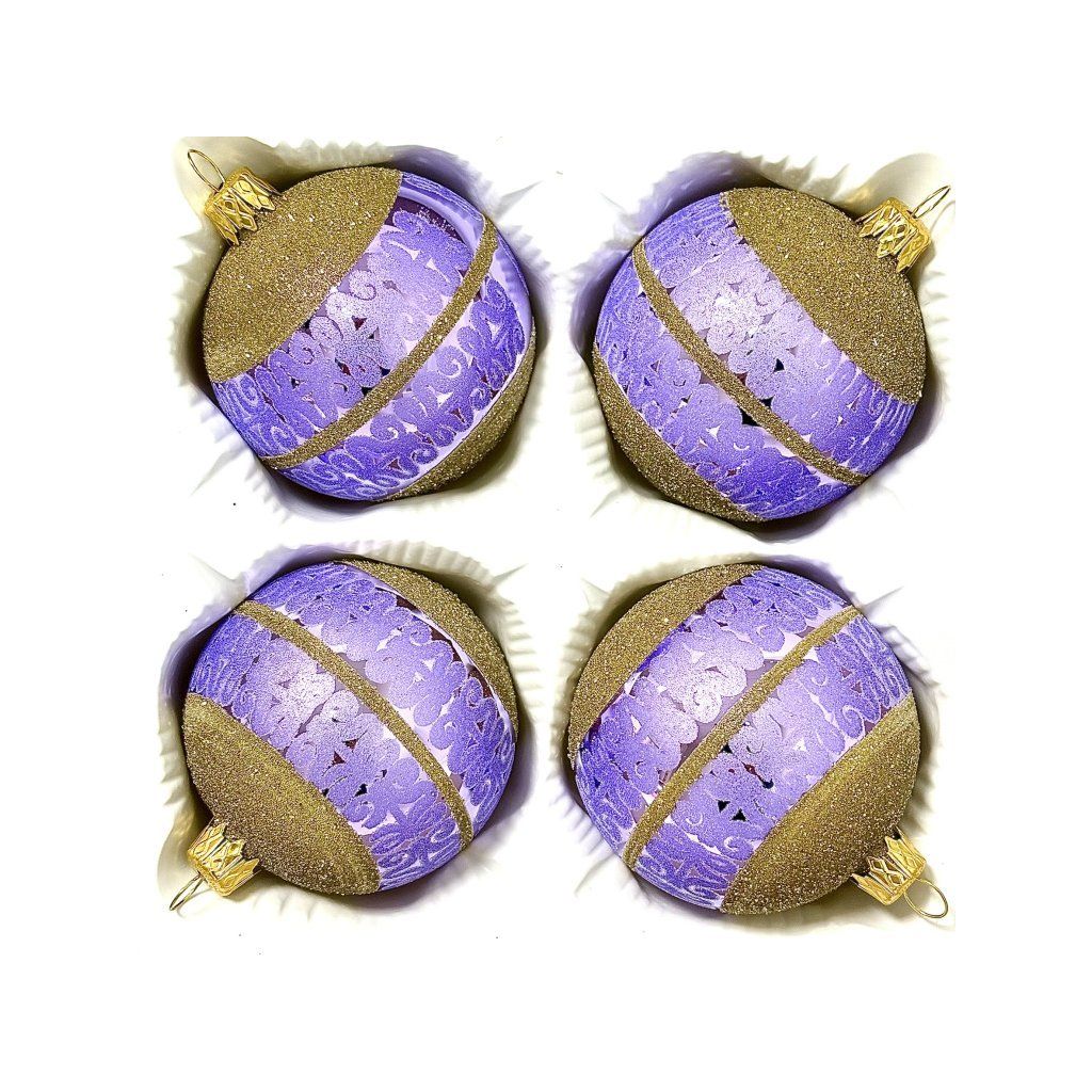 Ručne fúkané gule z českého skla s priemerom 7 cm. Lesklý fialový pruh so zamatovým reliéfom lemujú dve úzke linky a koncové polovice z hustého zlatého glitrového „piesku“. Súprava 4 ks v ochrannej papierovej krabičke.