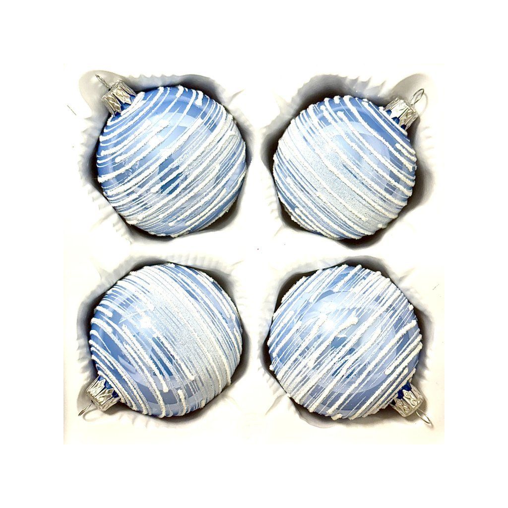Ručne fúkané gule z českého skla s priemerom 7 cm. Matný ľadovo modrý podklad pretínajú nepravidelné biele „mrazivé“ ťahy s jemným kryštalickým leskom. Súprava 4 ks v ochrannej papierovej krabičke.