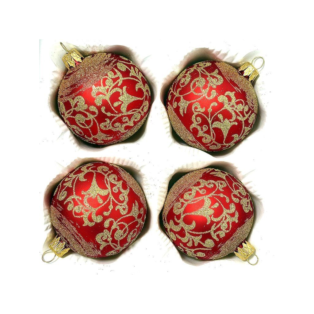 Ručne fúkané gule z českého skla s priemerom 7 cm s matne červeným povrchom a zložitým ornamentálnym vzorom zo zlatého glitra. Súprava štyroch kusov v ochrannej papierovej krabičke.