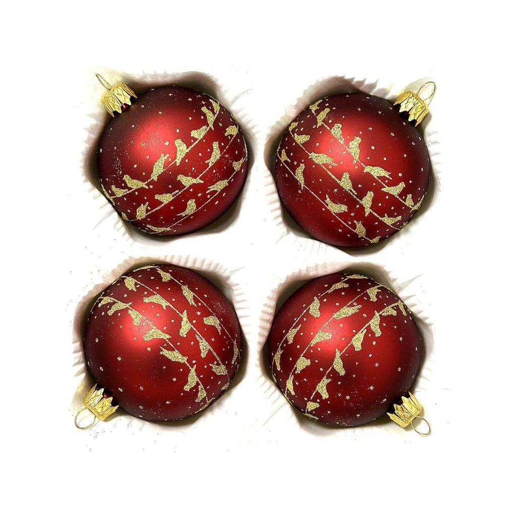 Sklenená vianočná guľa Ø 7 cm – Matná červená so zlatými vtáčikmi (sada 4 ks)