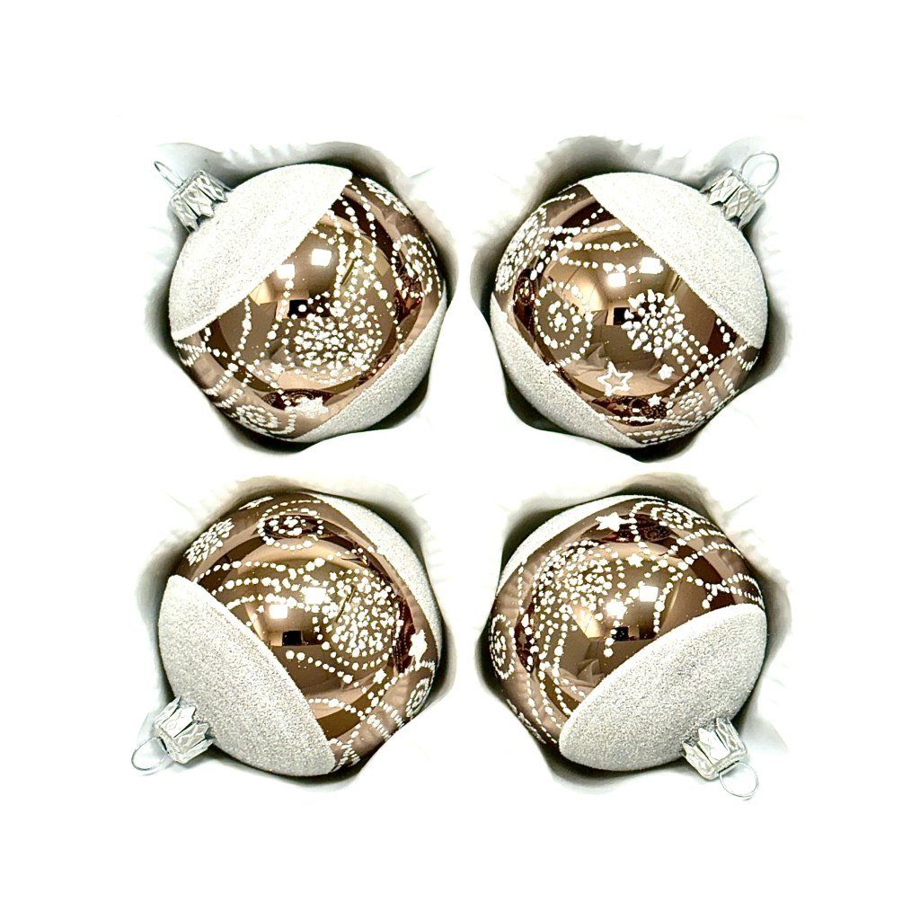 Ručne fúkané gule z českého skla v zrkadlovo medenom lesku. Polovica gule zdobená snehobielym pieskovým efektom, polovica bodkovanými špirálami a hviezdičkami. Súprava 4 ks v pevnej papierovej krabičke.