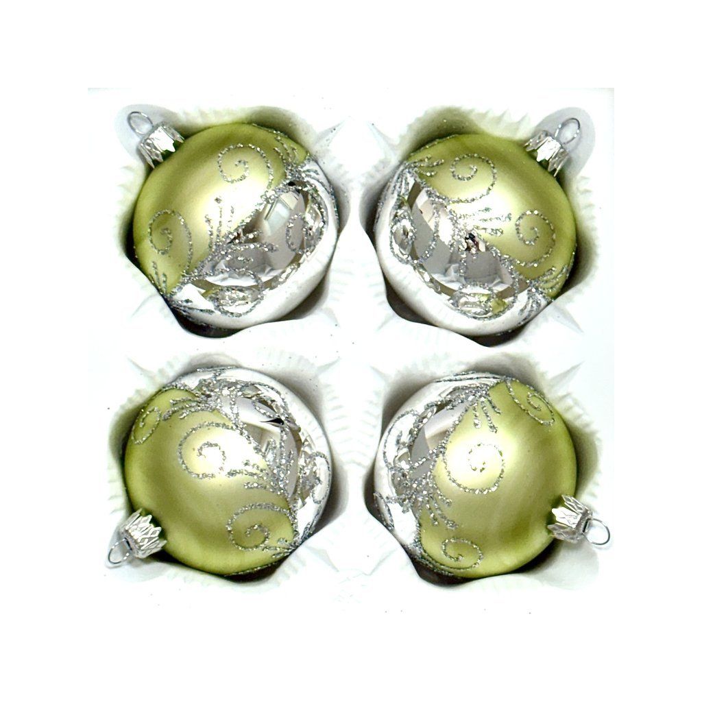 Ručne fúkané gule z českého skla s priemerom 7 cm. Polomatný olivovo zelený povrch prechádza do zrkadlovo striebornej polovice, oboje prepája jemná arabesková linka zo strieborného glitra. Súprava 4 ks v ochrannej papierovej krabičke.