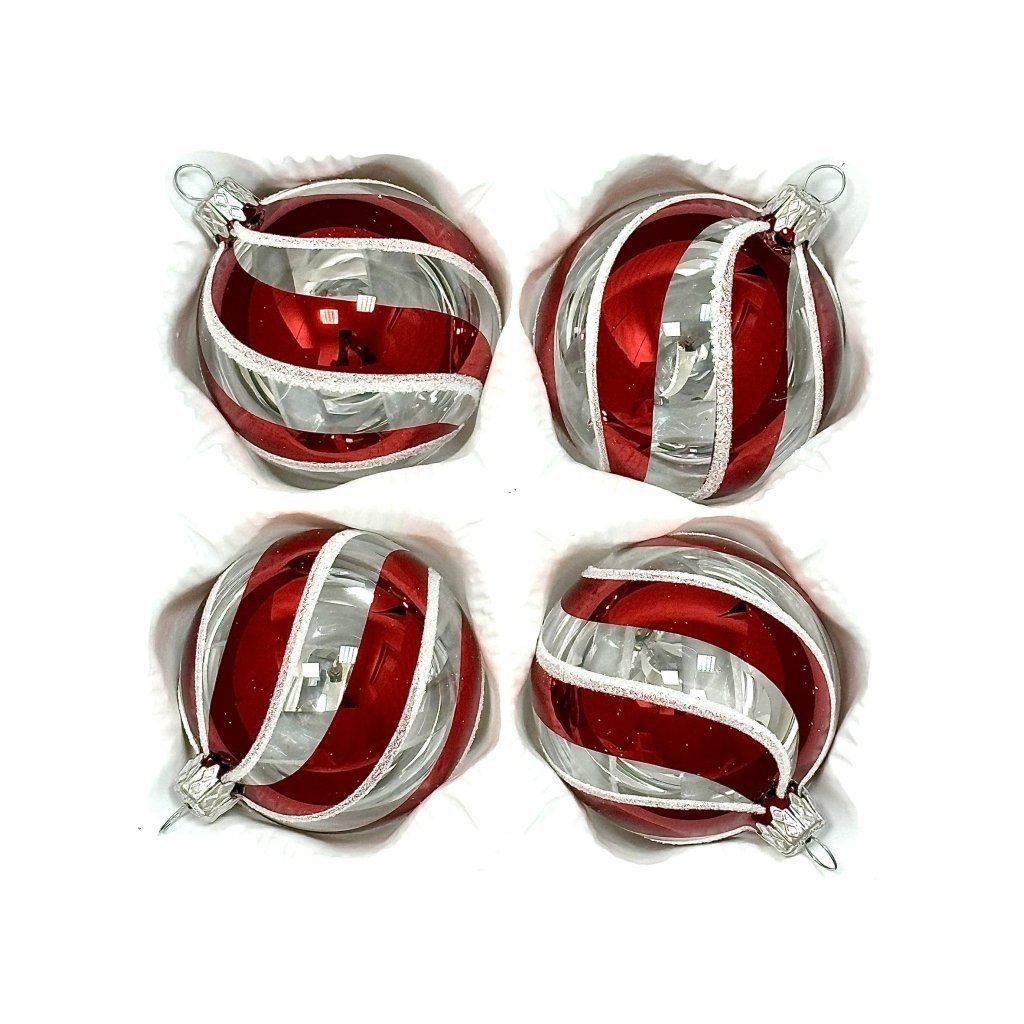 Ručne fúkané gule z českého skla s priemerom 7 cm. Číre sklo obtáča rubínovo červené špirálové pruhy, orámované zamatovo bielym „mrazom“. Súprava 4 ks v ochrannej papierovej krabičke.