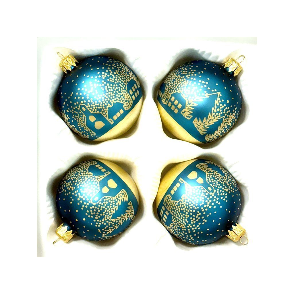 Sklenená vianočná guľa Ø 7 cm – tyrkysová so zasneženou dedinkou (sada 4 ks)