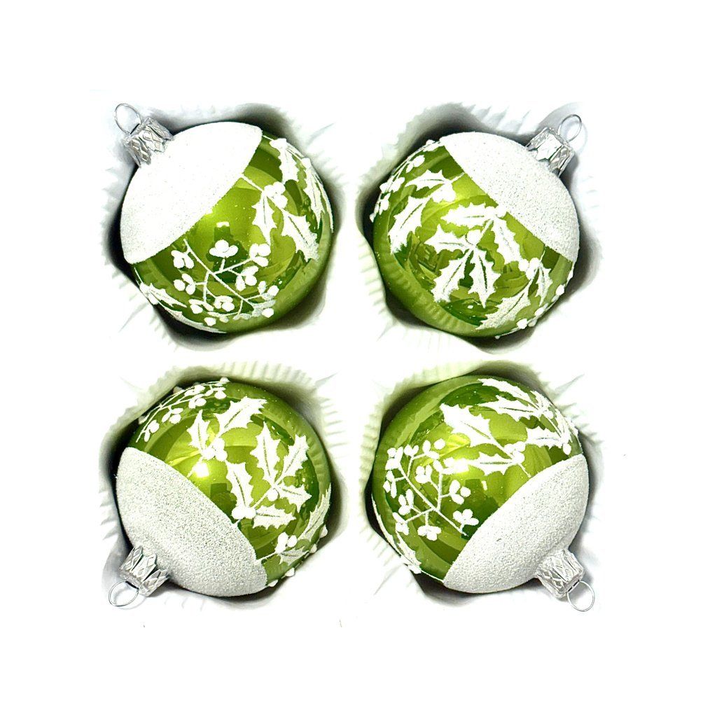 Sklenená vianočná guľa Ø 7 cm – zelená s mrazovou čiapkou a bielym cesmínovým dekorom (sada 4 ks)