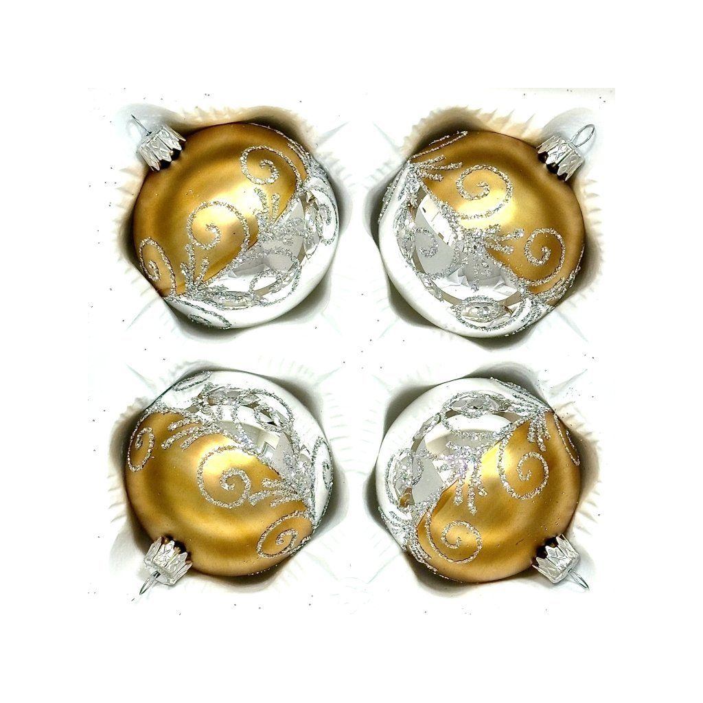 Ručne fúkané gule z českého skla s priemerom 7 cm. Zamatovo zlatý povrch prechádza do zrkadlovo striebornej polovice; obe časti zdobí špirálová arabeska zo strieborného glitra. Súprava 4 ks v ochrannej papierovej krabičke.