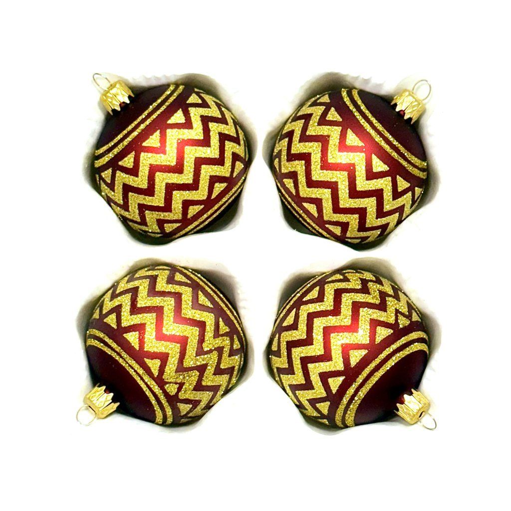 Ručne fúkané gule z českého skla s priemerom 7 cm. Saténovo vínovo červený podklad zdobí bohatý zlatý cik-cak vzor z jemného glitra, orámovaný dvojicou zlatých liniek. Súprava 4 ks v ochrannej papierovej krabičke.