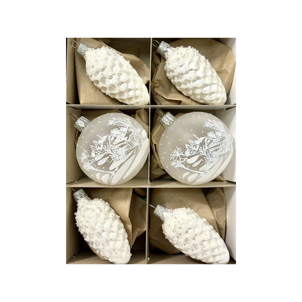Biele sklenené gule a šišky 7 cm – zimná krajina ( sada 6 ks )