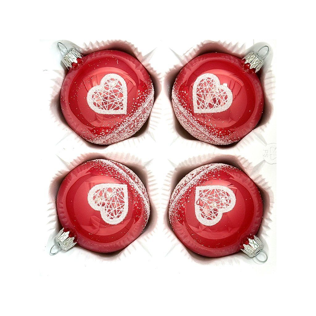 Červené sklenené vianočné gule so srdcom 7 cm – súprava 4 ks