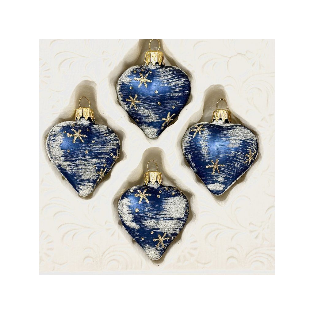 Dodajte svojmu vianočnému stromčeku jedinečný šmrnc s týmto setom štyroch ručne fúkaných a maľovaných sklenených srdiečok o veľkosti 7 cm. Modrý podklad zdobený striebornými ťahmi a jemnými zlatými hviezdami pôsobí slávnostne a elegantne zároveň. Ozdoby sú vyrobené tradičným českým sklárskym remeslom a vďaka svojej originalite vnesú do vášho domova kúzelnú zimnú atmosféru. Set je balený v darčekovej krabičke a je tak aj krásnym tipom na vianočný darček.
