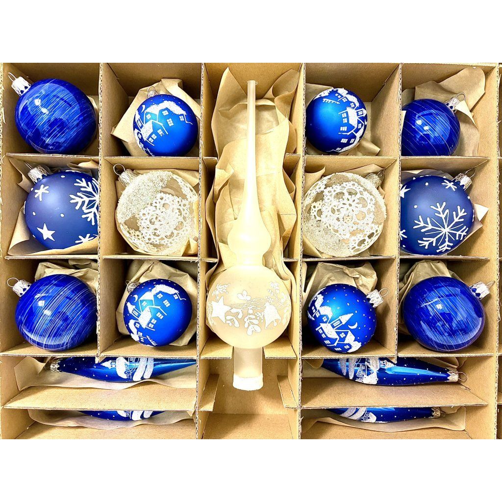 Jedinečná kolekcia 37 ručne fúkaných a maľovaných vianočných ozdôb v noblesnej kombinácii modrej a bielej farby vnesie na váš stromček kúzlo zimnej noci aj čistotu čerstvo napadaného snehu. Súprava obsahuje ozdoby rôznych tvarov – klasické gule, pretiahnuté tvary, špicu aj originálne zdobené motívy dedín, vločiek a krajkového vzoru. Každý kus je originál z dielne českých sklárov. Kolekcia je dostupná iba v jedinom exemplári a stane sa tak skutočným pokladom medzi vianočnými ozdobami.