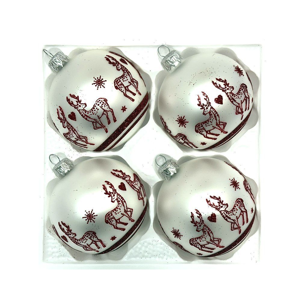 Liora – Biele vianočné gule 8 cm s červenými jeleňmi - sada 4 ks