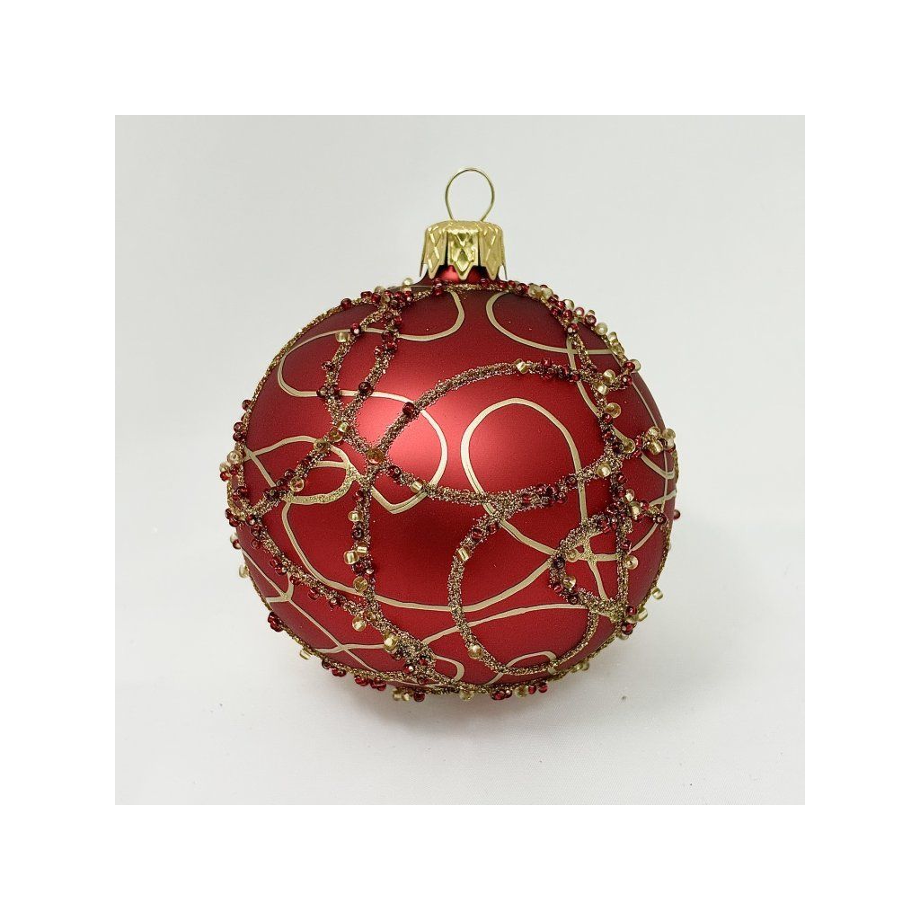 Elegantná červená vianočná guľa 8 cm s ručne tvoreným zlatým a červeným dekorom. Originálna ručne fúkaná ozdoba českej výroby.