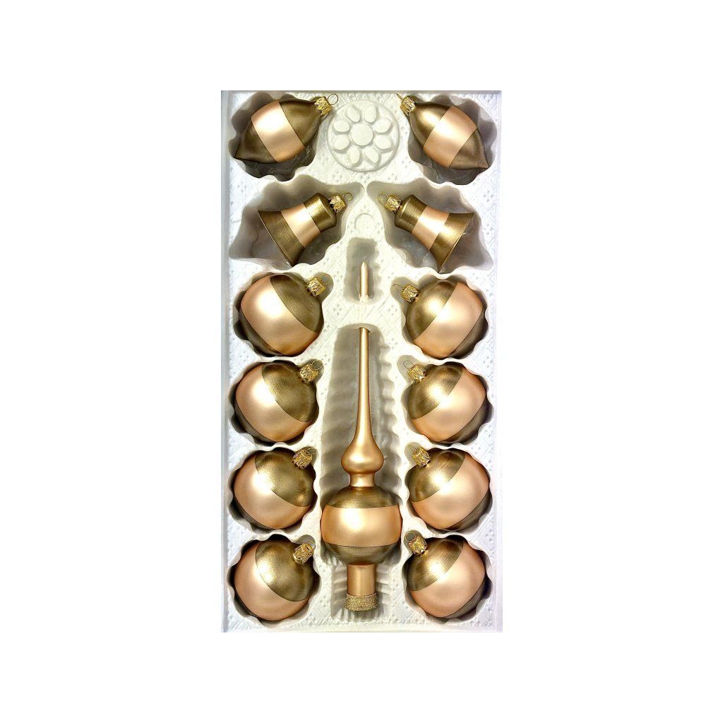 Elegantná bronzovo-zlatá sada 13 ks sklenených vianočných ozdôb so špicou. Ručná práca z českého skla dodá vášmu stromčeku noblesný vzhľad.