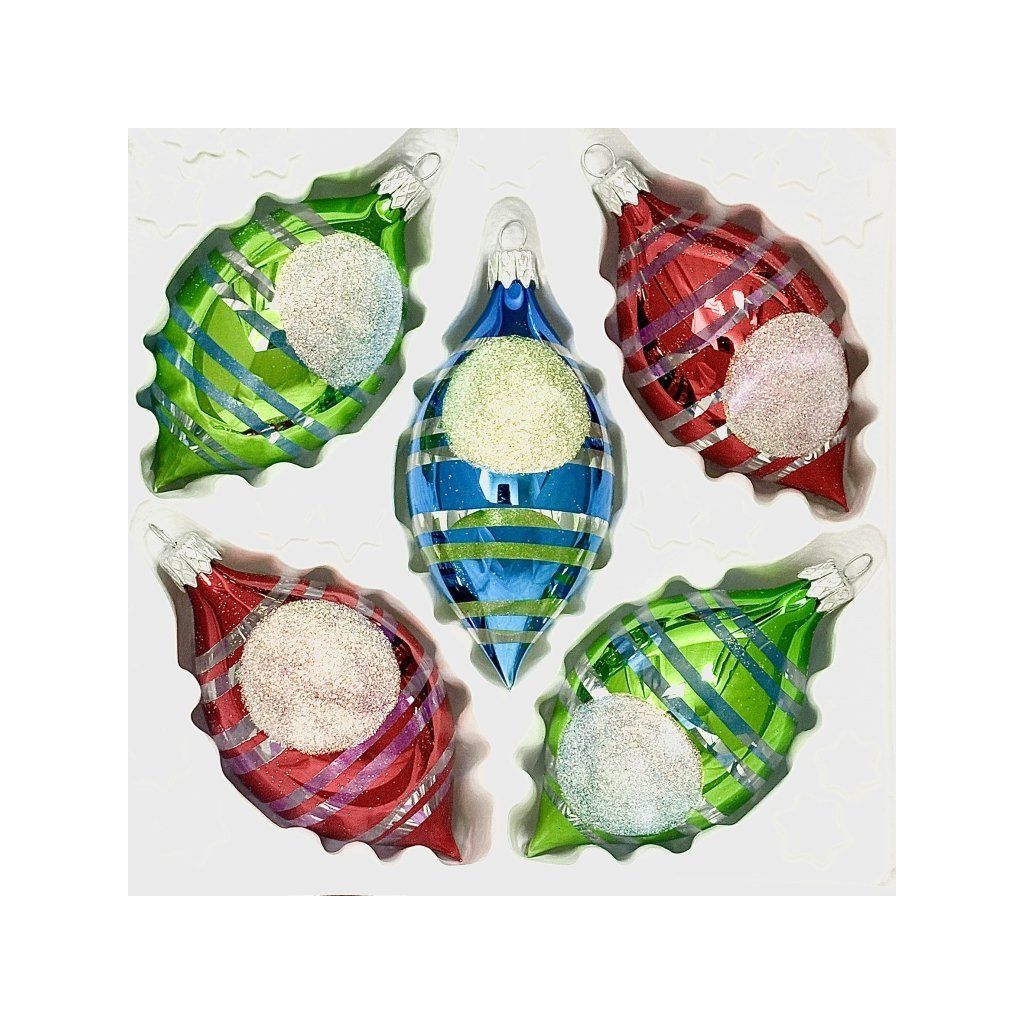 Pestrofarebná sada 5 ručne fúkaných retro olív o veľkosti 7 cm v tónoch červenej, modrej a zelenej. Ozdoby s typickým bielym stredom a pruhmi zaujmú leskom aj nostalgiou.